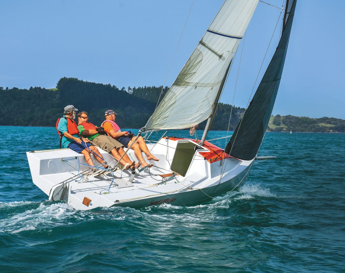 Dave, his son Dylan and I took her out for the first sail in a 10–16 knot sou’wester with a chop – typical Kawau Bay conditions. Upwind she heeled and stiffened, pointing high and tracking well with neutral helm. She banged a bit in the waves – again, not unexpected in a light boat with a flat section forward.