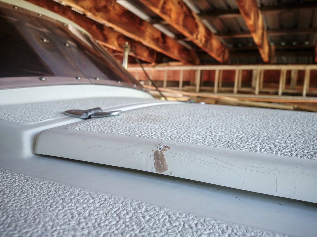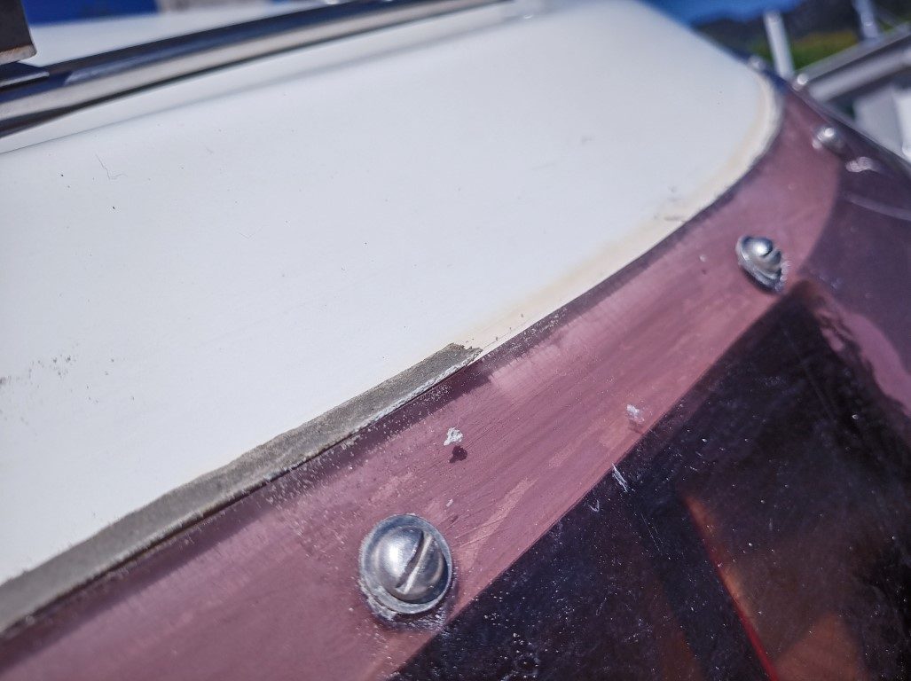 Compared to their full-time water brethren, trailer-sailer rigs probably get less overall exposure to the elements, but repeated mast stepping and unstepping can be unkind to rigging wires, bottlescrews, etc., so standing rigging needs close inspection. I re-sealed the window edges and attended to various gel coat chips once I had the boat home.