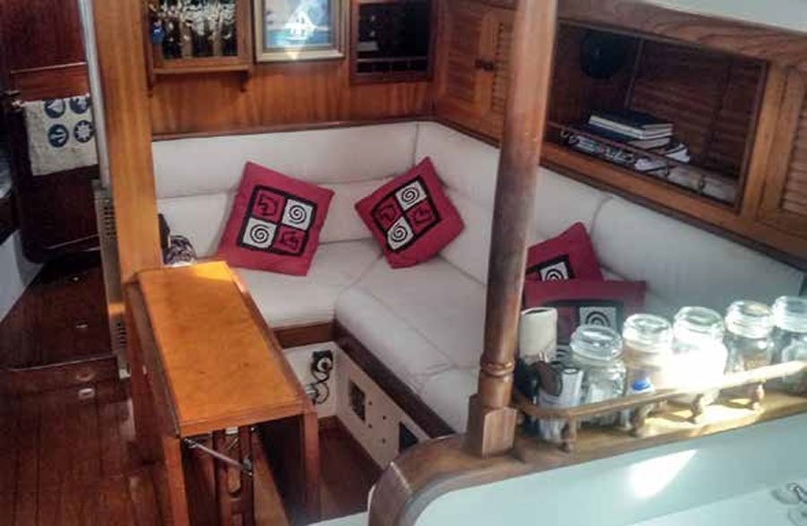 We had several more haul-outs at Boat Lagoon, spending some of the kids’ inheritance on a hard dodger and bimini which housed some extra solar panels, plus clears and a canvas ‘house’ for our cockpit. This necessitated moving the mainsheet traveller forward of the dodger and strengthening the cabin-top to take the load. The additions were fantastic, essentially giving us an extra room. It was designed to enable air flow, which is so necessary in hot climes, and yet it stays snug and dry in adverse weather.