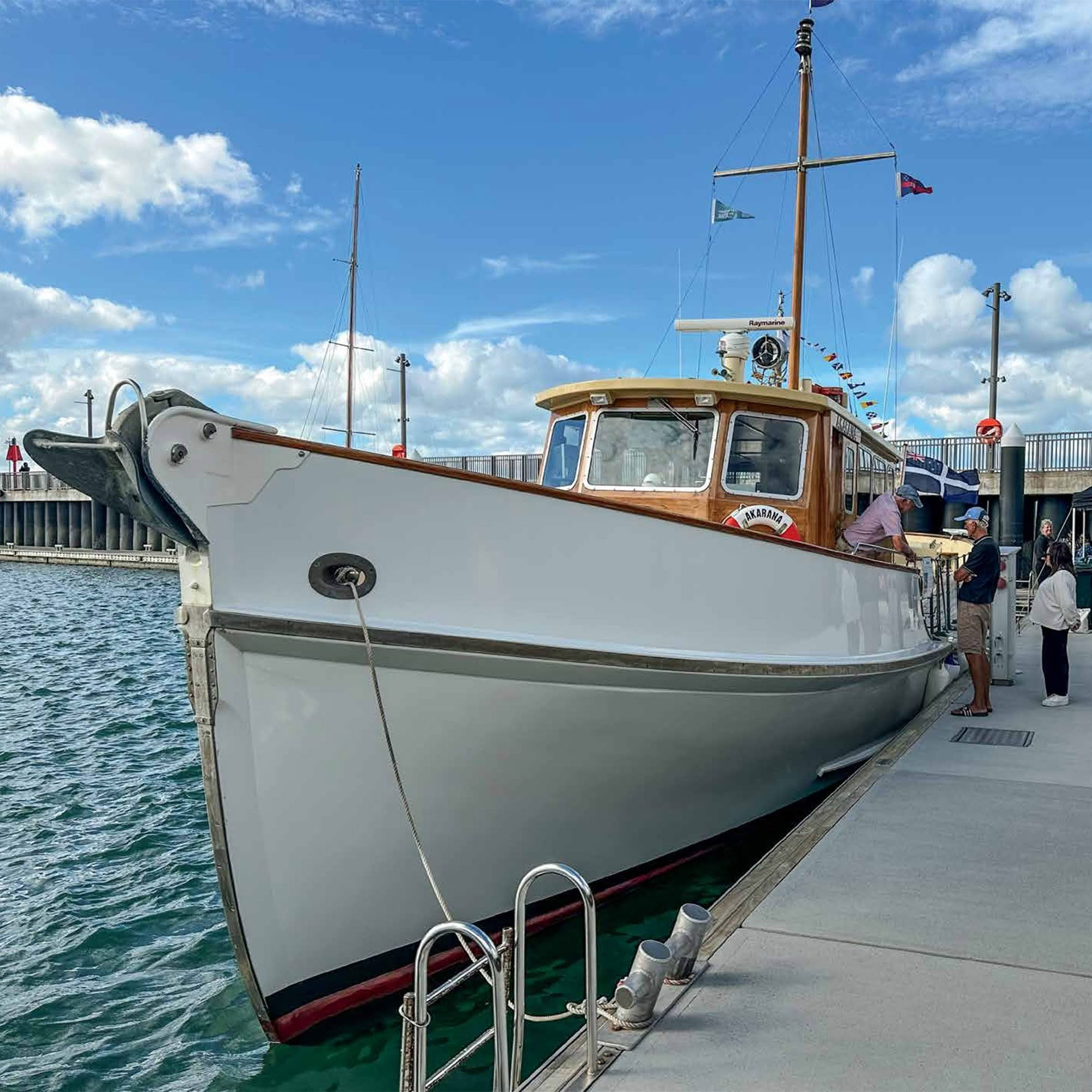 Firstly Akarana, a proud emblem of Auckland’s maritime history. She was designed by A. J. Collings and built by W. G. Lowe in 1960 for the Ports of Auckland. She saw service for 34 years until she was retired in late 1994 and sold to Peter McDonald. Six years later she was on-sold to her current owners, Dick and Colleen Fisher of Whangarei.
