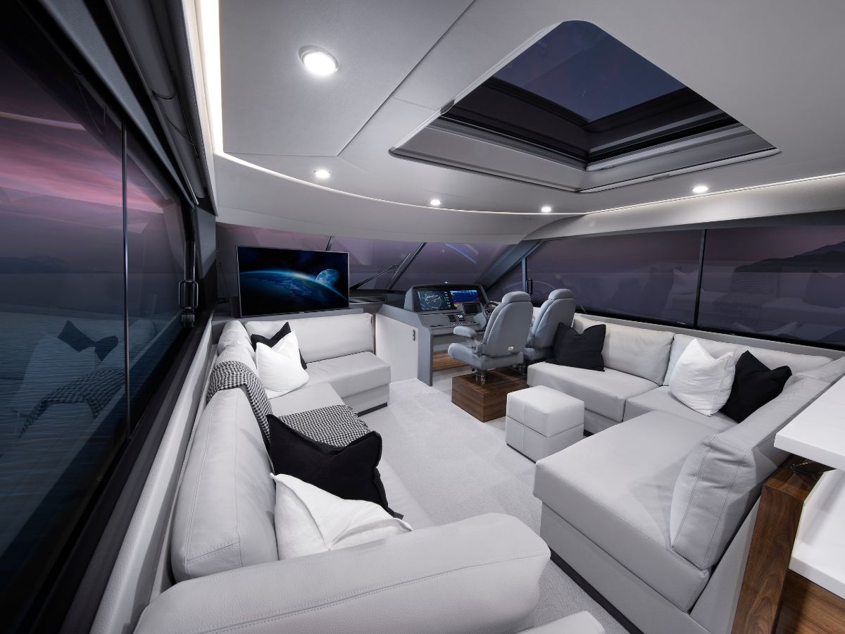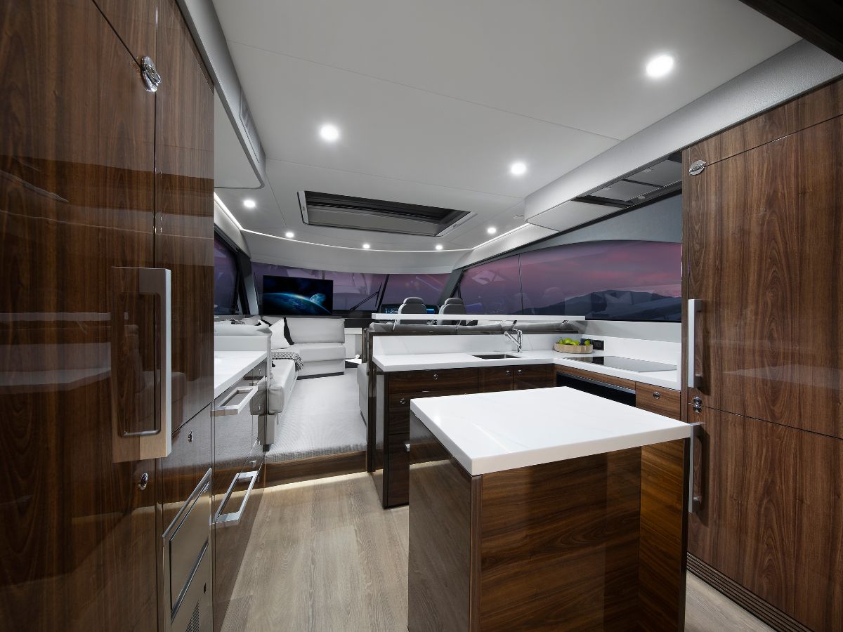 The luxurious saloon lounging area might be the considered the social hub of the vessel. Even though it is indoors, per se, the space is light and airy by virtue of the expansive, opening windows and optional sunroof. There is a more formal dining area, as well as options for viewing the large flat screen, but it excels with connecting anyone preparing meals or entertaining outside.