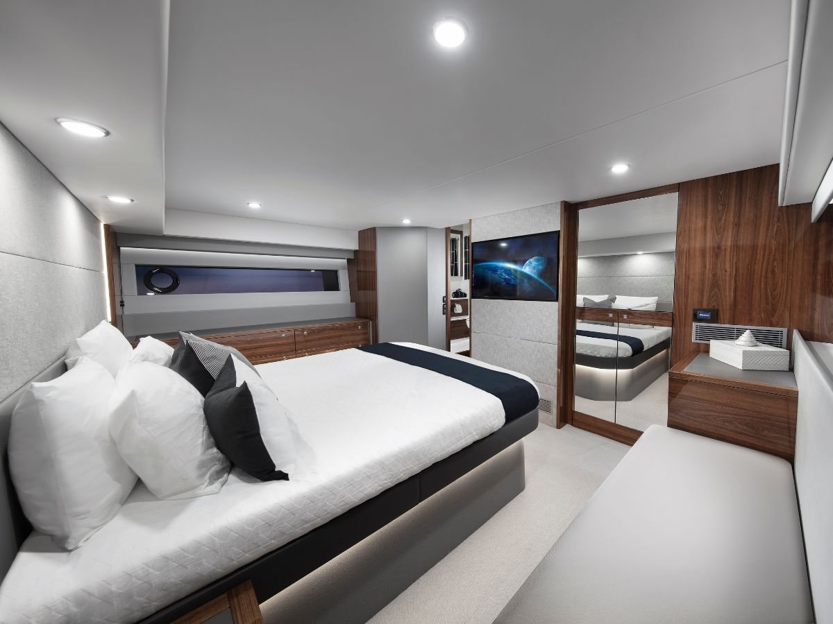 Heading into the accommodation spaces, and the VIP Stateroom has our angled bed for easy access to both sides. It has been lowered slightly, there is cleverly designed stowage underneath, including specific moulds for critical equipment, such as a vacuum, and there is the Black Edition cabinet across the front and down the left side for even more stowage. Maritimo has always delivered a common level floor in each cabin to avoid trip hazards, and the S60 very much continues this standard.” — Phil Candler, Maritimo Operations Manager.