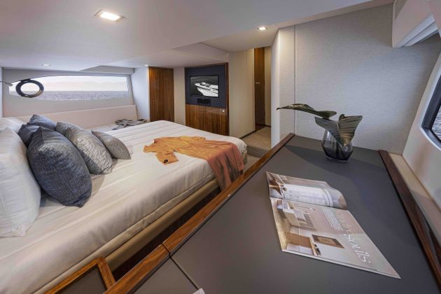 An aft gourmet galley, beautifully appointed saloon and an accommodation deck featuring private entry master suite, walk-around queen-size island bed, a designer bathroom and guest stateroom. The SUV collection also includes the 445, 465, 505, 585 and 645 models.