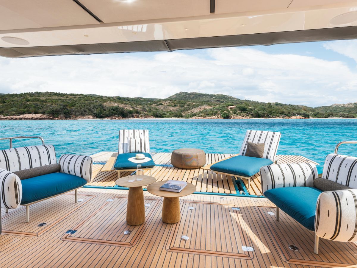 Aft, the EIGHTY 2’s cockpit leads directly to a 22 m² hydraulic swim platform. This transforms from tender dock to jet ski launch to an inviting water-level terrace for swimming and diving.