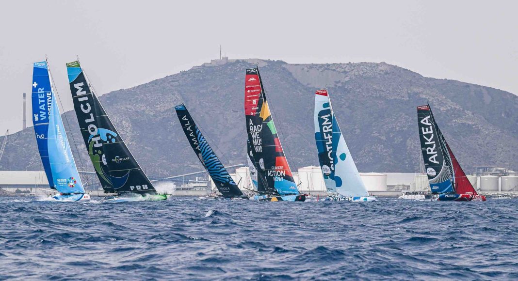 The fleet of seven IMOCA 60s left Cartagena this afternoon under blue skies and scattered clouds, marking the halfway point of The Ocean Race Europe 2025. With 12 to 17 knots of north-easterly breeze pressing against their sails, the mixed-gender crews wasted no time in powering upwind towards the scoring gate at Cabo de Palos.