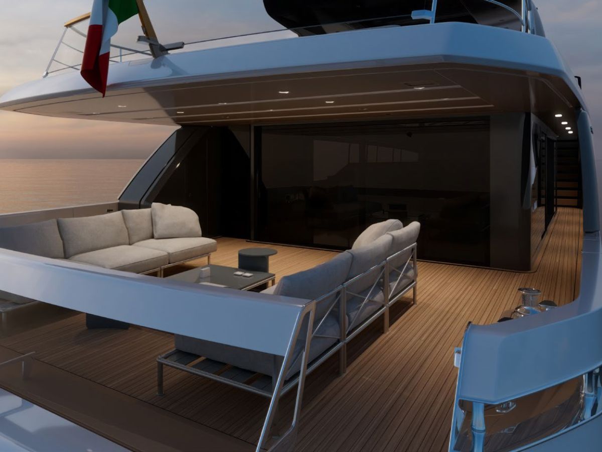 The bow has been turned into usable space with seating, sunpads, and a small pool. The anchor gear is hidden beneath a hatch to keep things clean and safe. At the other end, the stern includes a pivoting platform and garage for a tender and jetski. It also serves as a swim platform, with fold-out steps that lead back to the cockpit.