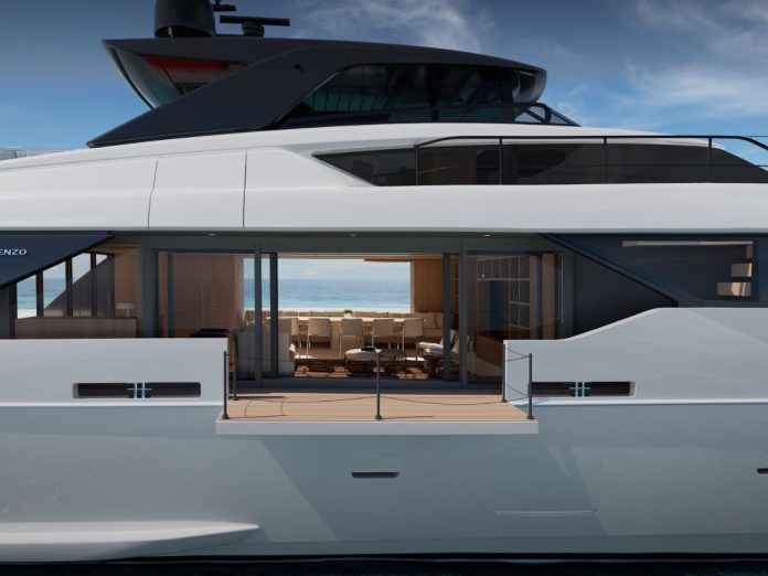 The SL110A raises the port side walkway and shifts it outboard. That lets the designers widen the interior on one side — especially useful in the saloon and owner’s cabin. There’s more floor space, more natural light, and better views from inside without increasing the boat’s footprint. A side terrace folds down from the saloon, giving guests direct access to the water.