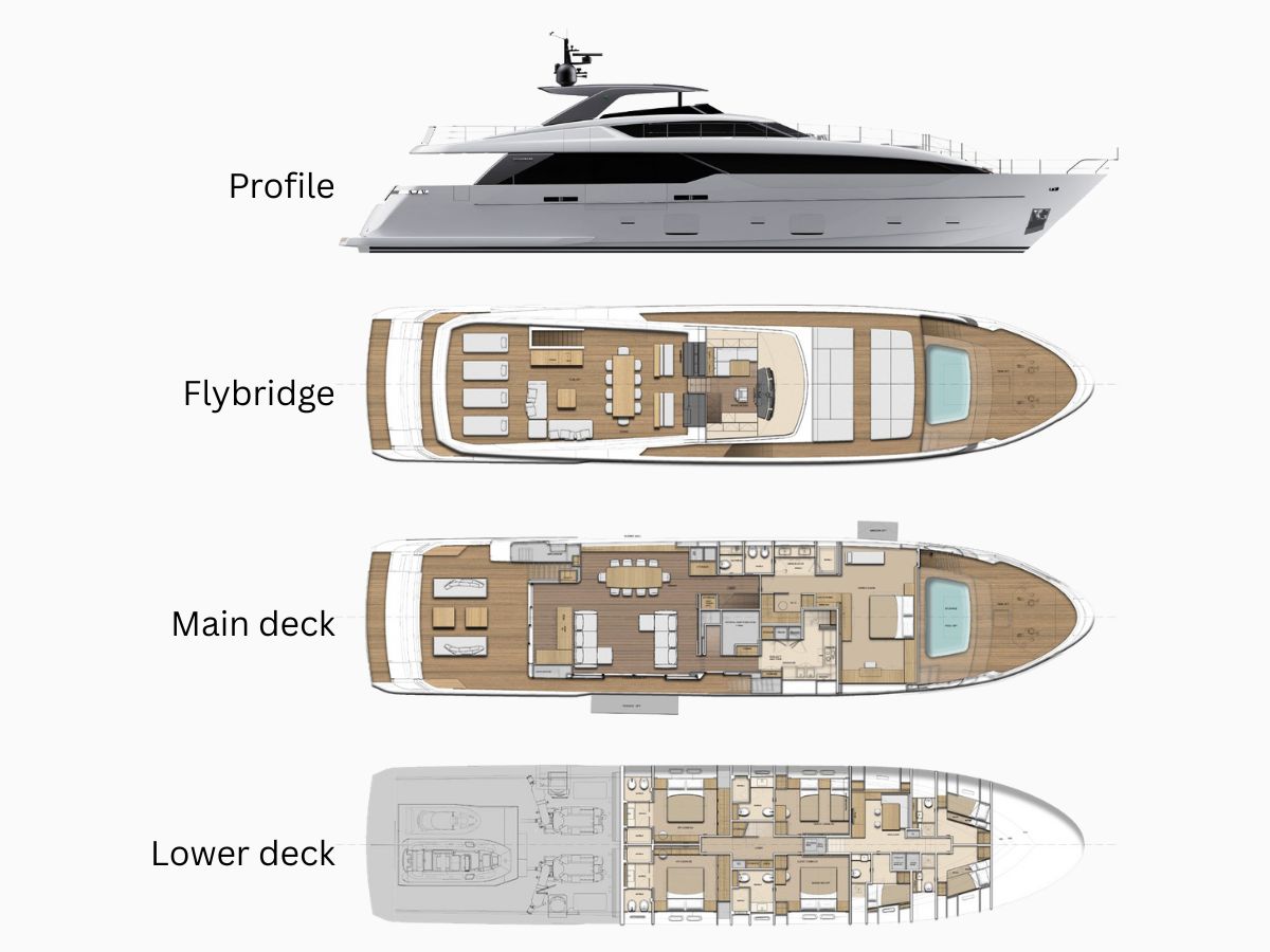 The main cabin (full-beam, forward on the main deck) has its own access to the bow, which is useful for privacy. Below deck are four more guest cabins and a separate crew area with space for six. There’s a second helm and extra outdoor space up on the flybridge.