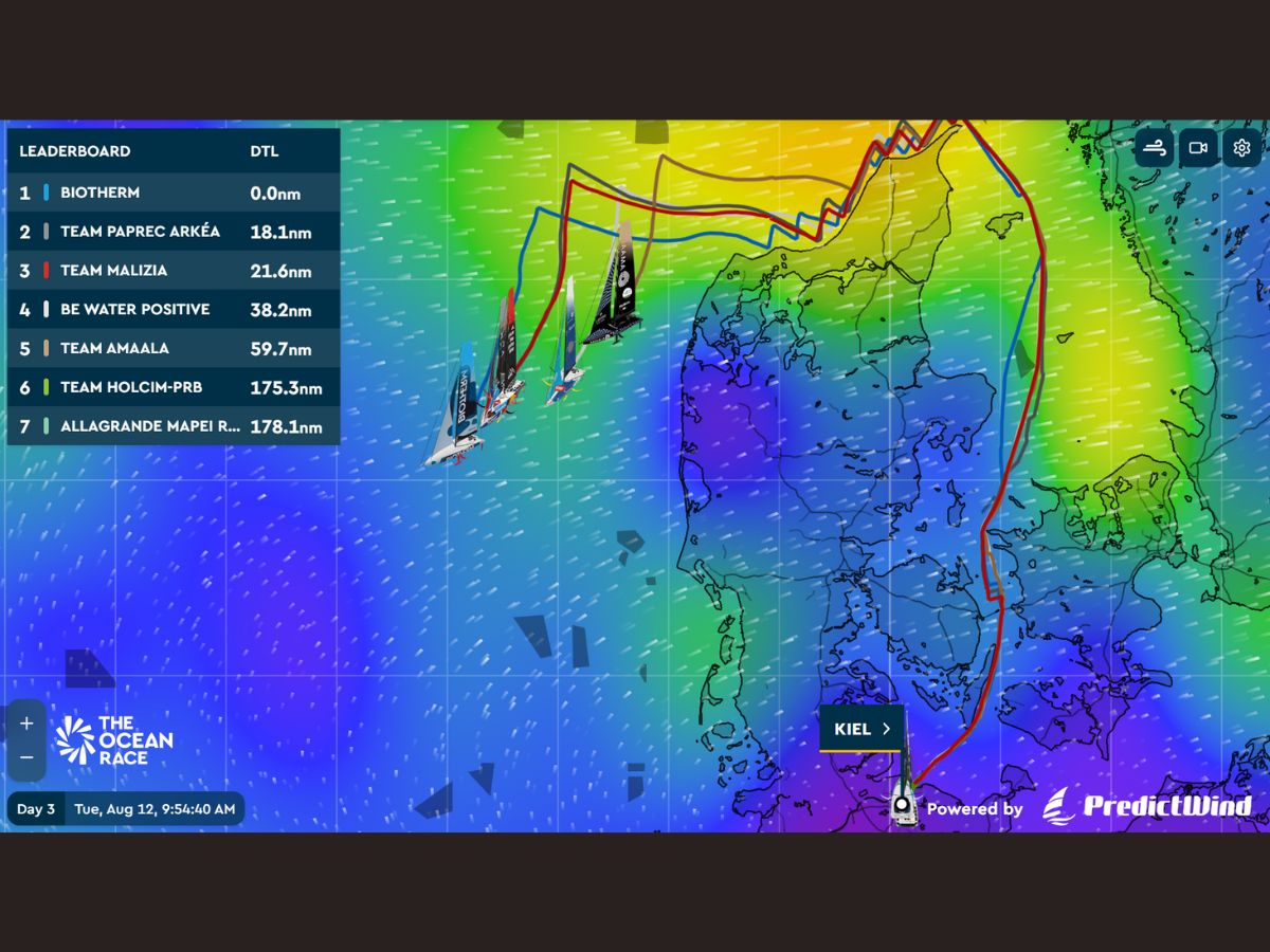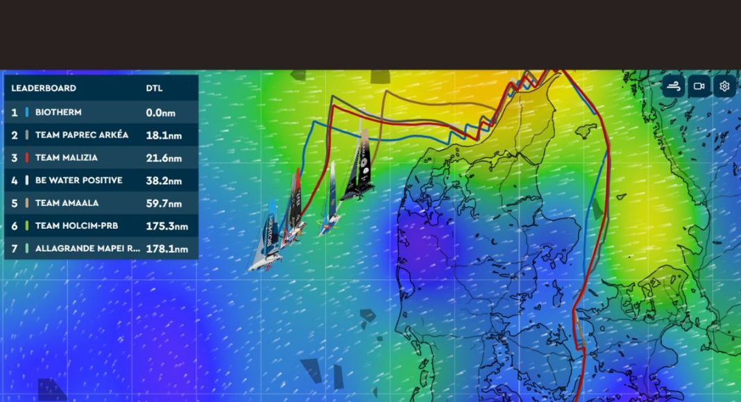 Biotherm, skippered by Paul Meilhat, grabbed the Kiel Lighthouse scoring gate for the first two bonus points, with Paprec Arkéa in second and Canada Ocean Racing – Be Water Positive in third. Meilhat’s crew kept the pressure on through the first night, sailing fast and smart in close company with Yoann Richomme’s Paprec Arkéa.