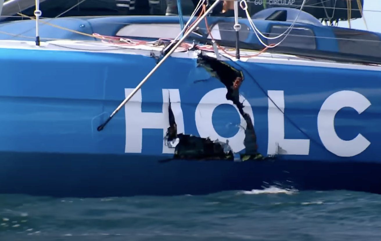 Worse still, Holcim PRB’s port hull took a blow, leaving a gash in the topsides. Onboard footage later showed crew members glancing down in disbelief as water hissed through the fractured laminate.