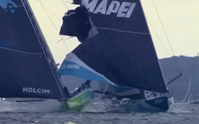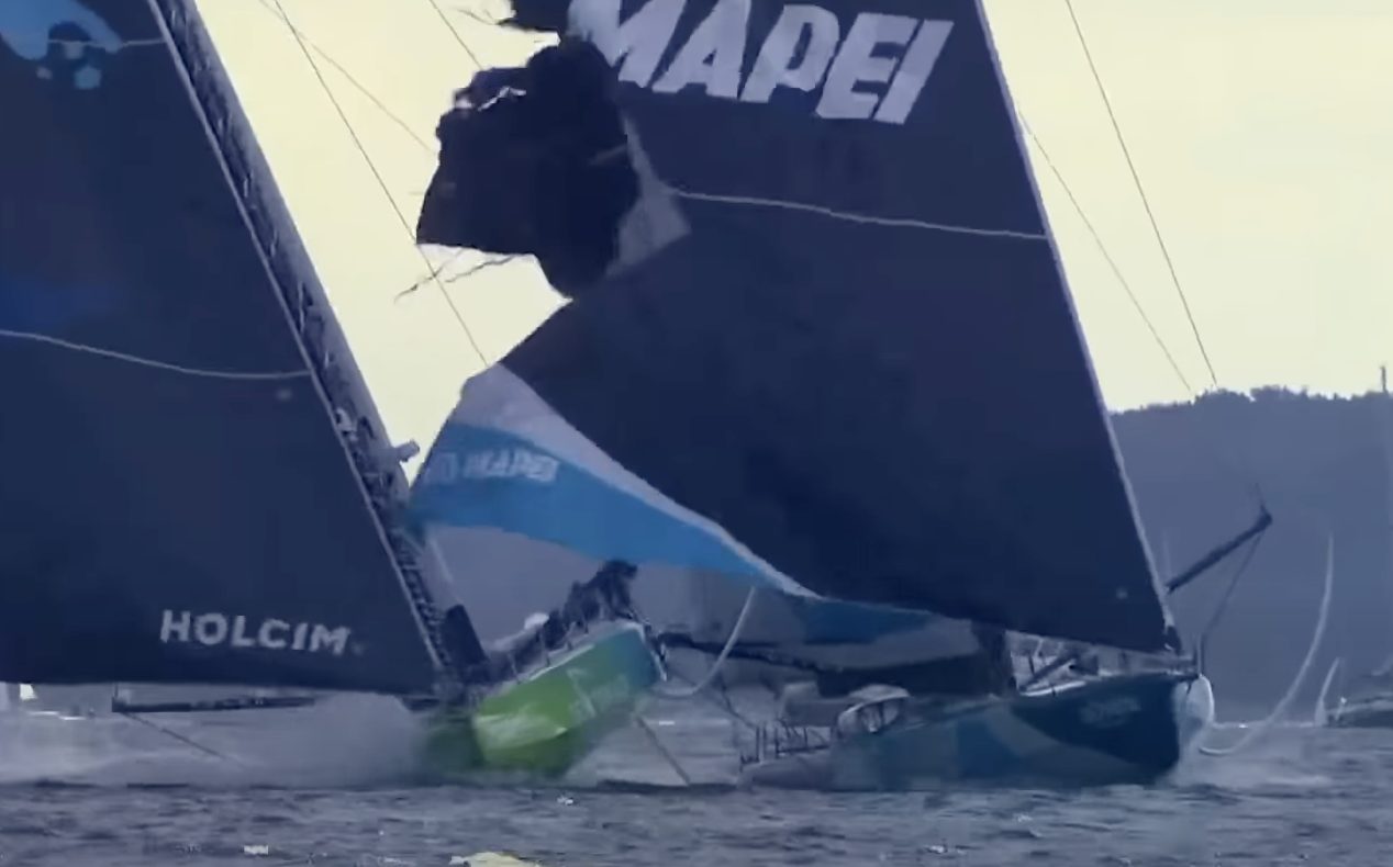 Holcim PRB broached, momentarily losing control. Mapei’s big headsail ripped, possibly on Holcim PRB’s rigging.