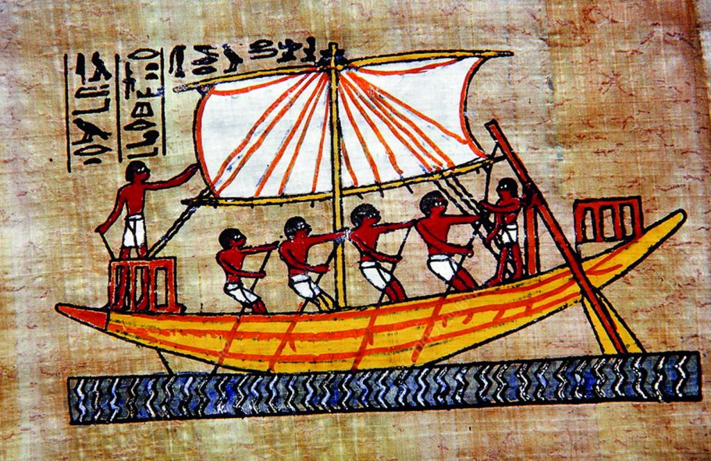 Egyptian archaeological evidence from around this time period also depicts boats with single square sails mounted on a central mast. The Nile River provided a perfect staging ground for early sail development with the prevailing winds blowing from north to south, countering the river’s south-to-north current. This allowed boats to travel in both directions efficiently – by sail downstream and by oar upstream. Egyptian ships were used for both trade and warfare, enforcing shipping laws, and transporting troops and supplies.