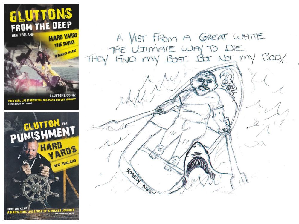 His boating exploits are many and varied – and rugged, of course. From deep sea fishing to recovering anchors from wrecks; memorable gigs of all kinds; and rowing his clunky dinghy Smelly Nelly from Waiheke to Mayor Island (well, sort of; there’s a shipwreck involved), they are all well worth sharing. Home truths aplenty – and about himself.