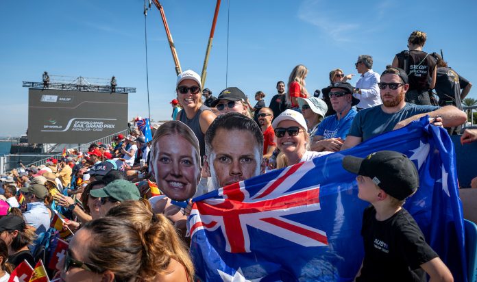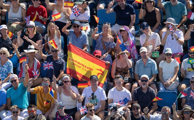 Spectators cheer the Spain SailGP F50 catamaran from the SailGP Grandstand inside the SailGP Race Stadium whilst in action on Race Day 1 of the DP World Spain Sail Grand Prix held in Cadiz, Spain Saturday 4 October 2025. Rolex SailGP Championship Event 11 2025 Season. Photo: Jason Ludlow for SailGP.