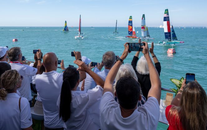 Guests in the Adrenaline Lounge watch the action as the SailGP fleet race past on Race Day 1 of the DP World Spain Sail Grand Prix held in Cadiz, Spain Saturday 4 October 2025. Rolex SailGP Championship Event 11 2025 Season. // Photo credit: Andrew Baker for SailGP.