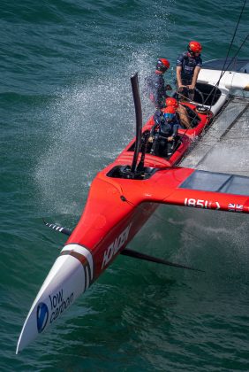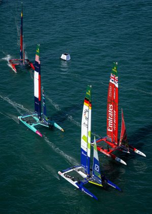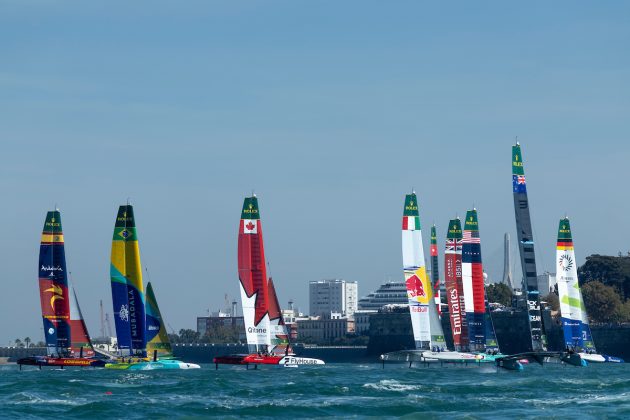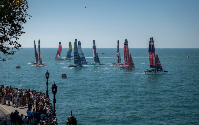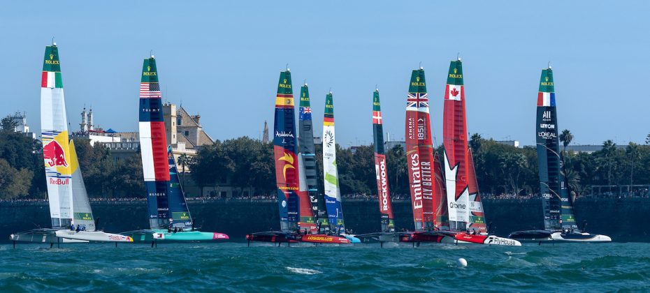 Emirates Great Britain SailGP Team helmed by Dylan Fletcher leads Germany SailGP Team presented by Deutsche Bank helmed by Erik Heil, USA SailGP Team helmed by Taylor Canfield, Canada NorthStar SailGP Team helmed by Giles Scott and New Zealand SailGP Team helmed by Peter Burling in front of spectators on the Sea Wall on Race Day 1 of the DP World Spain Sail Grand Prix held in Cadiz, Spain Saturday 4 October 2025. Rolex SailGP Championship Event 11 2025 Season. Photo: Samo Vidic for SailGP.