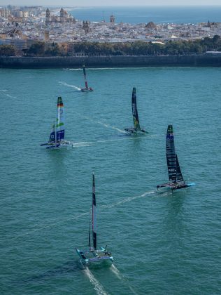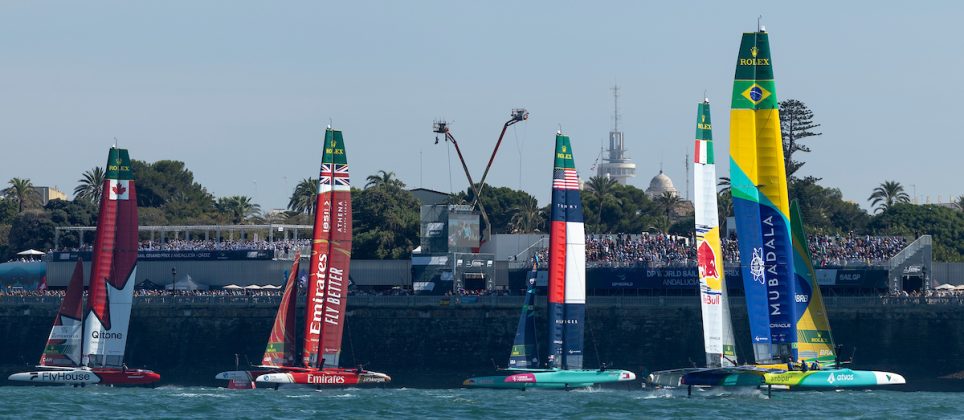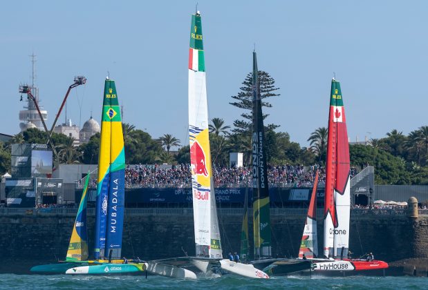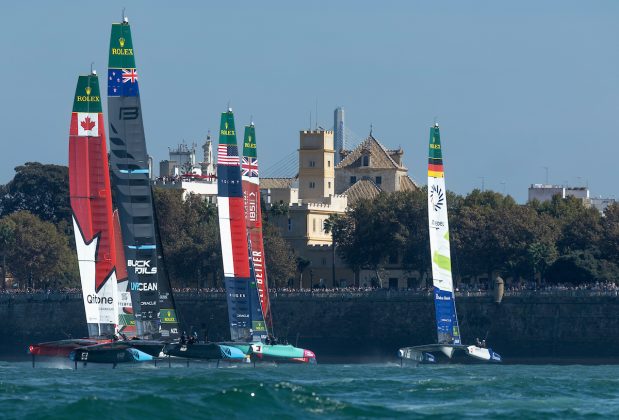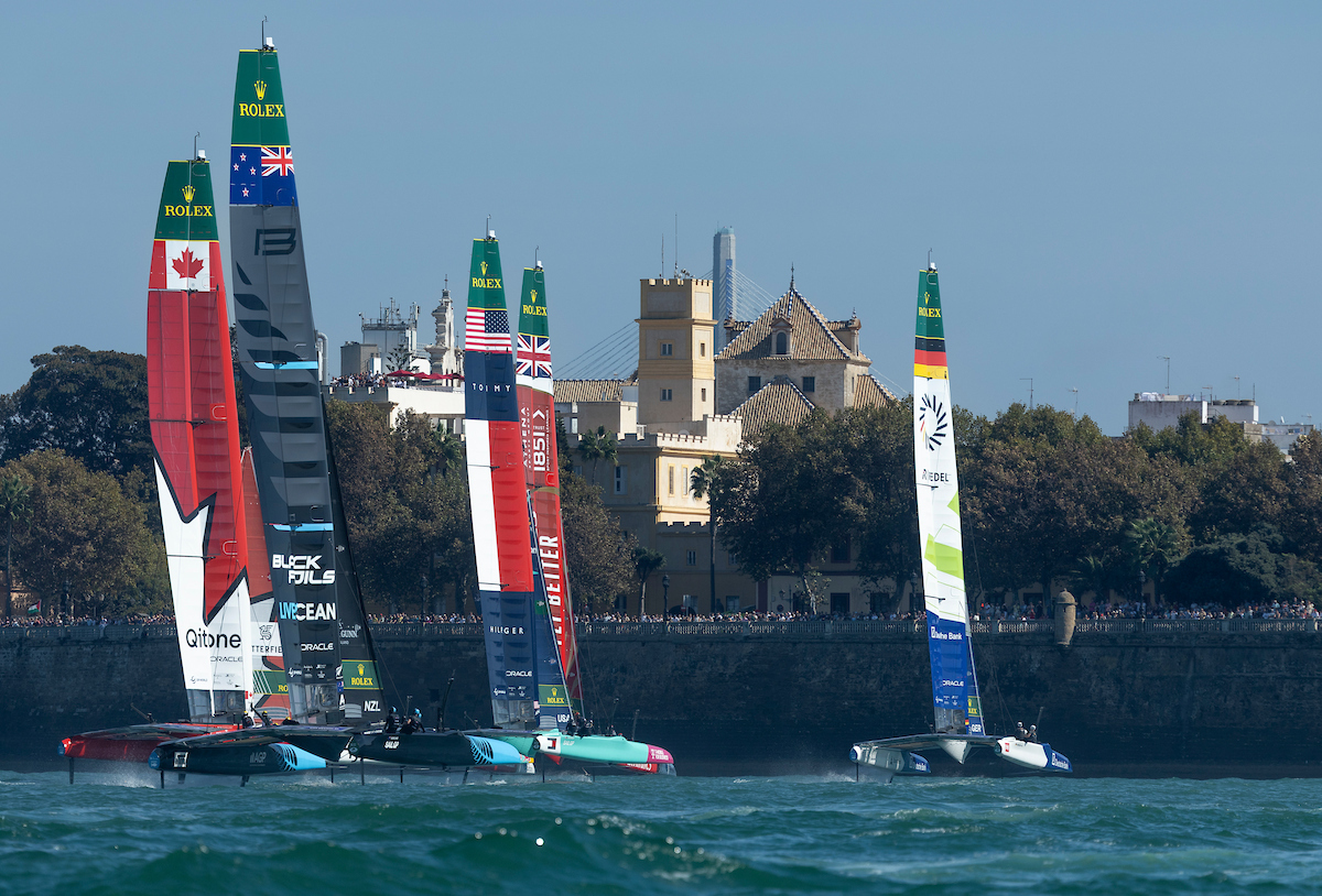 Canada NorthStar SailGP Team helmed by Giles Scott leads Emirates Great Britain SailGP Team helmed by Dylan Fletcher, USA SailGP Team helmed by Taylor Canfield, Red Bull Italy SailGP Team helmed by Ruggero Tita and Mubadala Brazil SailGP Team helmed by Martine Grael in front of the grandstand and Pergola Lounge on Race Day 1 of the DP World Spain Sail Grand Prix held in Cadiz, Spain Saturday 4 October 2025. Rolex SailGP Championship Event 11 2025 Season. Photo: Samo Vidic for SailGP.