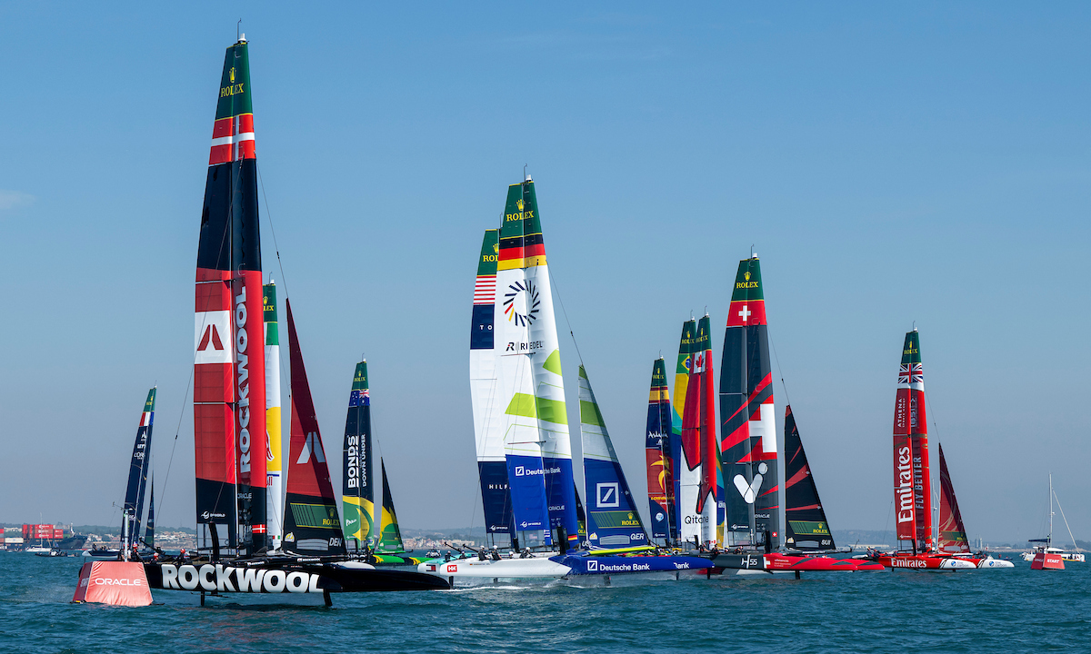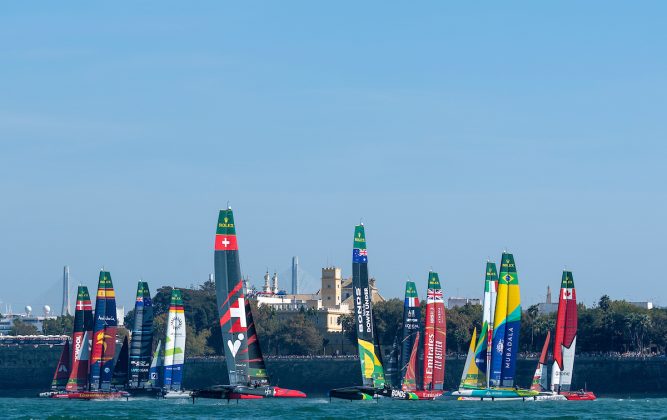 Start of race 1 as Emirates Great Britain SailGP Team helmed by Dylan Fletcher lead ahead of Switzerland SailGP Team helmed by Sebastien Schneiter on Race Day 1 of the DP World Spain Sail Grand Prix held in Cadiz, Spain Saturday 4 October 2025. Rolex SailGP Championship Event 11 2025 Season. Photo: Ricardo Pinto for SailGP.