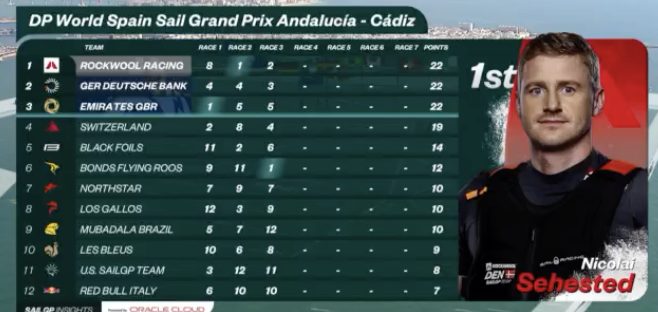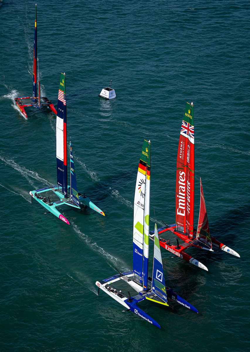 Germany SailGP Team presented by Deutsche Bank helmed by Erik Heil leads Emirates Great Britain SailGP Team helmed by Dylan Fletcher, USA SailGP Team helmed by Taylor Canfield and Spain SailGP Team helmed by Diego Botin in action on Race Day 1 of the DP World Spain Sail Grand Prix held in Cadiz, Spain Saturday 4 October 2025. Rolex SailGP Championship Event 11 2025 Season. Photo: Felix Diemer for SailGP.