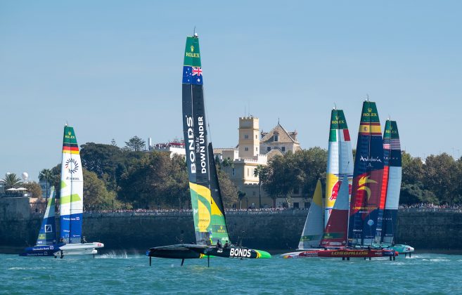 Switzerland SailGP Team helmed by Sebastien Schneiter, BONDS Flying Roos SailGP Team helmed by Tom Slingsby and Mubadala Brazil SailGP Team helmed by Martine Grael and the SailGP fleet in action in front of the sea wall on Race Day 1 of the DP World Spain Sail Grand Prix held in Cadiz, Spain Saturday 4 October 2025. Rolex SailGP Championship Event 11 2025 Season. Photo: Samo Vidic for SailGP.