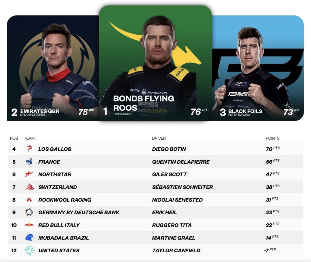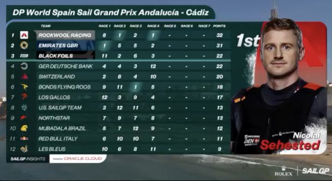 Spain SailGP Team helmed by Diego Botin leads Germany SailGP Team presented by Deutsche Bank helmed by Erik Heil, BONDS Flying Roos SailGP Team helmed by Tom Slingsby, New Zealand SailGP Team helmed by Peter Burling and USA SailGP Team helmed by Taylor Canfield towards Cadiz on Race Day 1 of the DP World Spain Sail Grand Prix held in Cadiz, Spain Saturday 4 October 2025. Rolex SailGP Championship Event 11 2025 Season. Photo: Felix Diemer for SailGP.