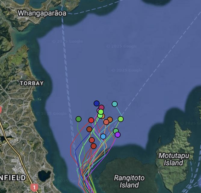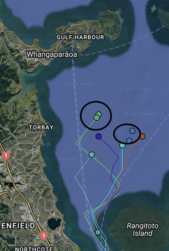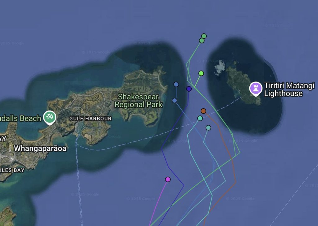 12:02pm: Lucky is pushing to the front! Between Tiritiri Matangi and Whangaparaoa, Bryon and the team have taken the lead. Callisto is there close to Shakespear Regional Park (light blue).
