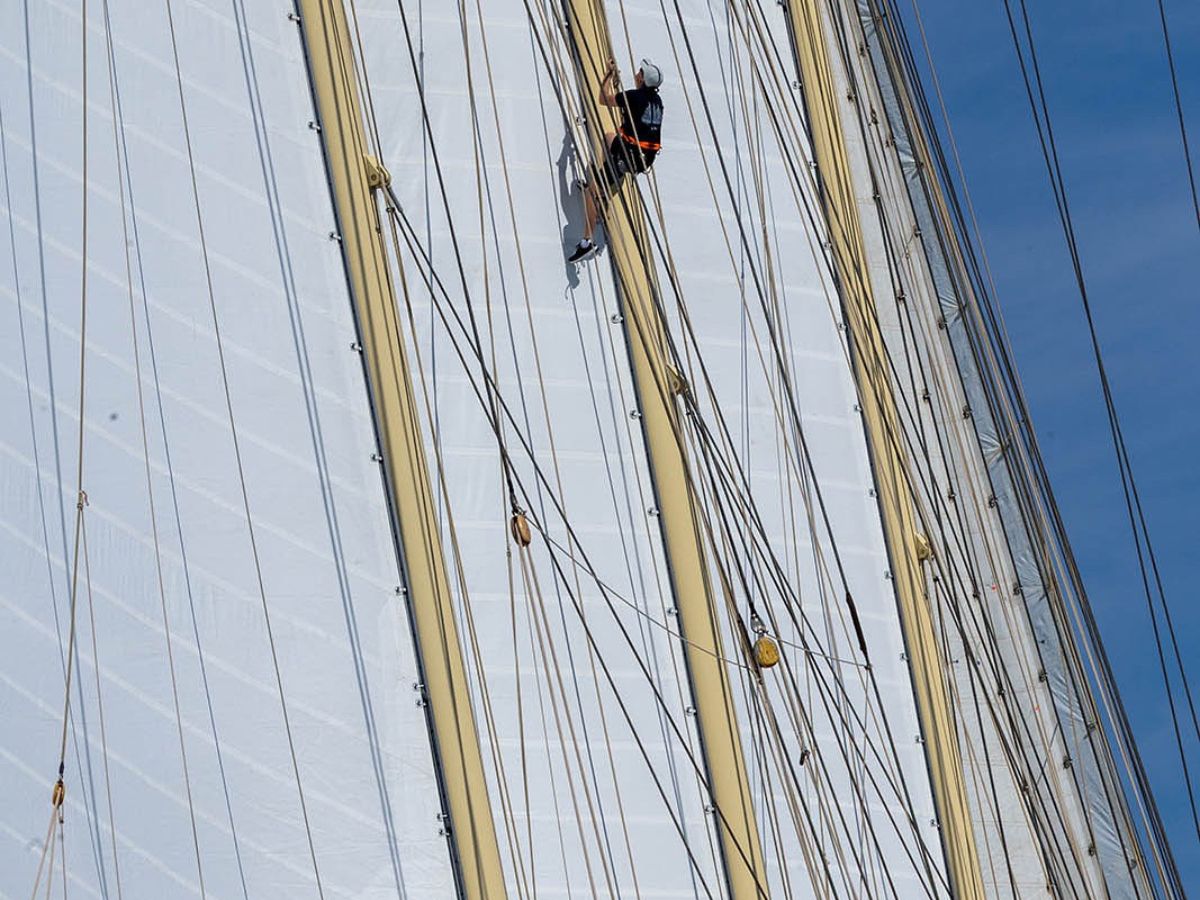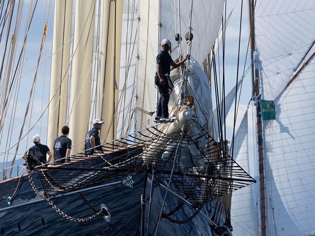 With an LOA of 65-metres, the start phases require the utmost attention from the 30 members of the crew as they try to locate ‘the clearest zone possible’ for powering up the 300 tonnes of boat powered by 1,750 m2 of sail area split between ten sails. To step things up a gear with what Fosse calls a ‘Hollywood sail area’, a spinnaker and several ‘fisherman’ sails must be hoisted to fly a whopping 2,600 m2 of sail on this icon of yachting.