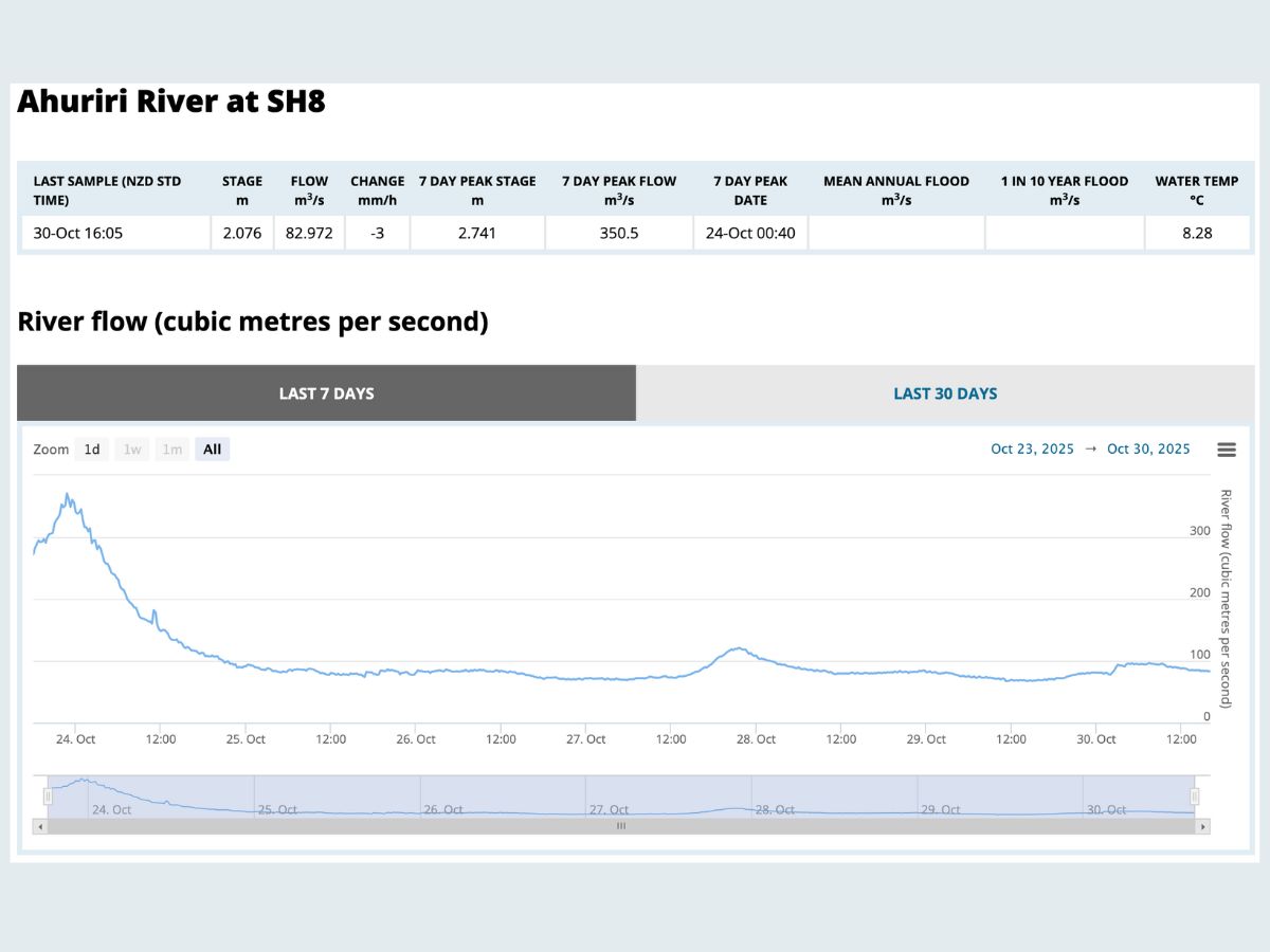 For example, on the Ahuriri River at SH8, a recent spike on 24 October lifted flow to 350 m³/s, the sort of surge that would transform an ordinary boating day into something far riskier. A week later, levels had dropped to a more manageable 80 m³/s.