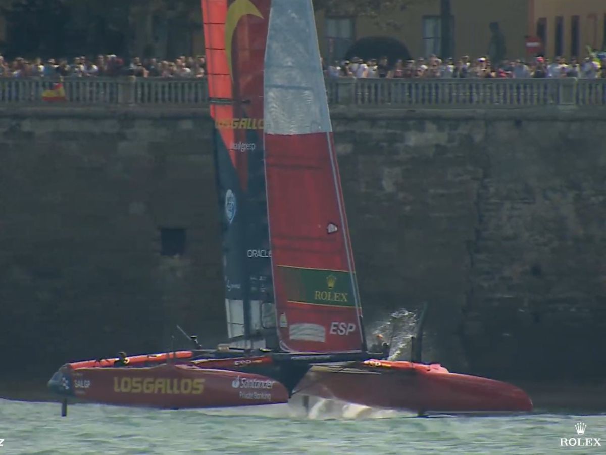 As the crowd roared along the seawall, Spain rounded the final mark cleanly and sprinted down the finishing leg.