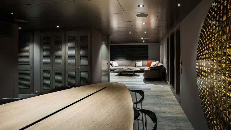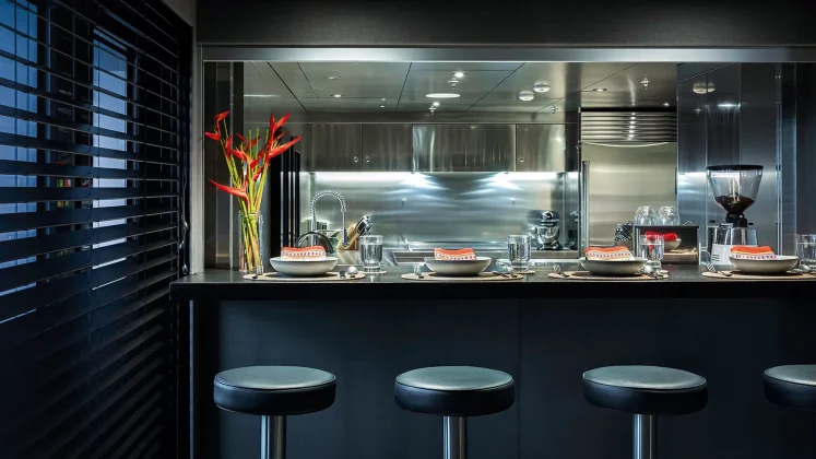 The main deck houses a broad, open-plan saloon and dining area with wrap-around glazing and direct access to the galley. Guests can sit at a breakfast bar while the chef works in a professional-grade kitchen; a design that suits both private use and charter operations. The main dining table comfortably seats twelve, backed by soft lounges and a full-height TV wall for movie nights or briefings.