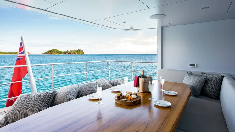 Moving aft, a covered outdoor dining zone doubles as a day lounge, sheltered by the deck above but open to the sea air. It’s a favourite breakfast spot, large enough for the full guest complement.