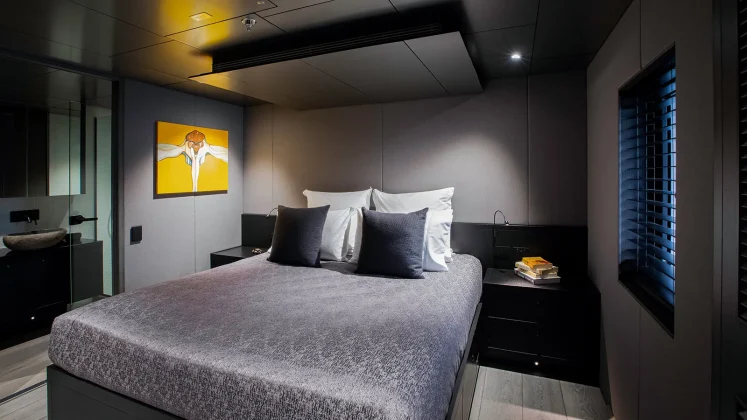 The yacht’s five guest cabins sleep up to twelve. The full-beam owner’s suite sits forward on the main deck with panoramic views and its own en-suite bathroom. Two king-berth cabins occupy the lower deck amidships, each with en-suite, while a convertible twin/king cabin and a four-berth bunk cabin round out the accommodation, ideal for family or crew overflow. Every cabin has a private en-suite and independent air-conditioning.