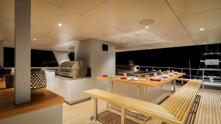 | Dining areas | 3 outdoor (aft deck, upper deck, flybridge) + 1 indoor formal dining + galley bar |