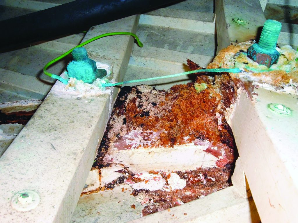 Installing zinc anodes and bonding all metal parts to the zinc can cause significant damage to timber adjacent to any of these fittings. Effectively, the potential (voltage) generated by the zinc will cause an alkali solution to form around these fittings, and this will eventually break down the structure of the timber.