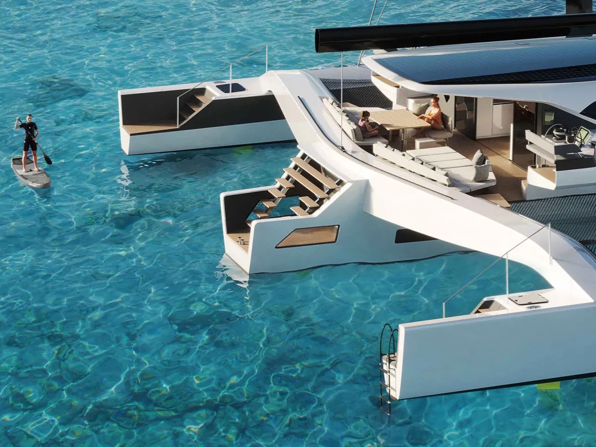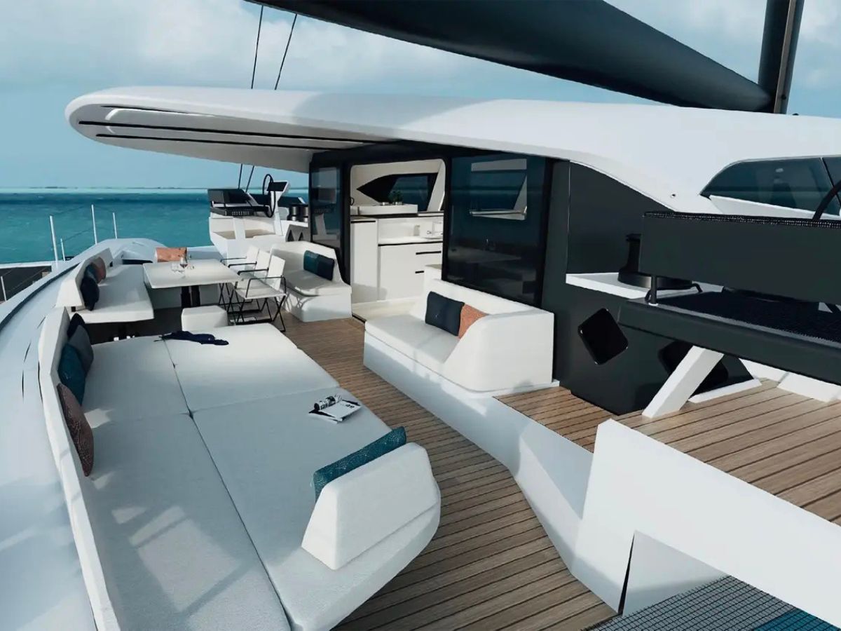 Aft, the cockpit becomes a protected outdoor living area. Seating and dining sit close to the centre of gravity to reduce pitching. The outboard floats hold storage and technical systems. These spaces sit low and wide, which improves stability and trim.