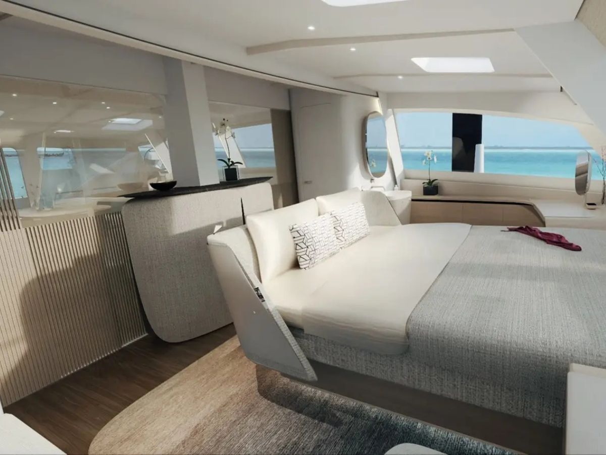 Step aboard and the tone shifts. The forward master suite spans the full width of the central hull. Private access and large windows create a calm, bright space. Lightweight composite structures help reduce noise and vibration while keeping the yacht on its strict weight budget.