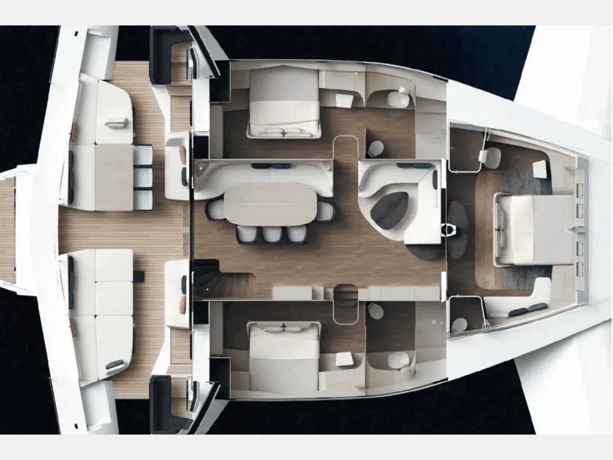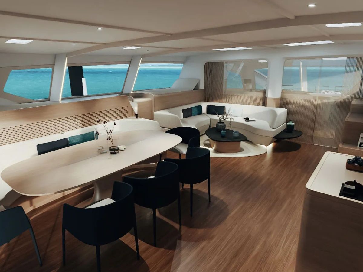 Guest cabins for six to eight people sit aft and midships. They are arranged for comfort on long voyages. Crew quarters sit apart to support extended offshore time. The main saloon runs across the central hull and uses a low-profile coachroof with wide glazing to offer clear, panoramic views without extra windage.