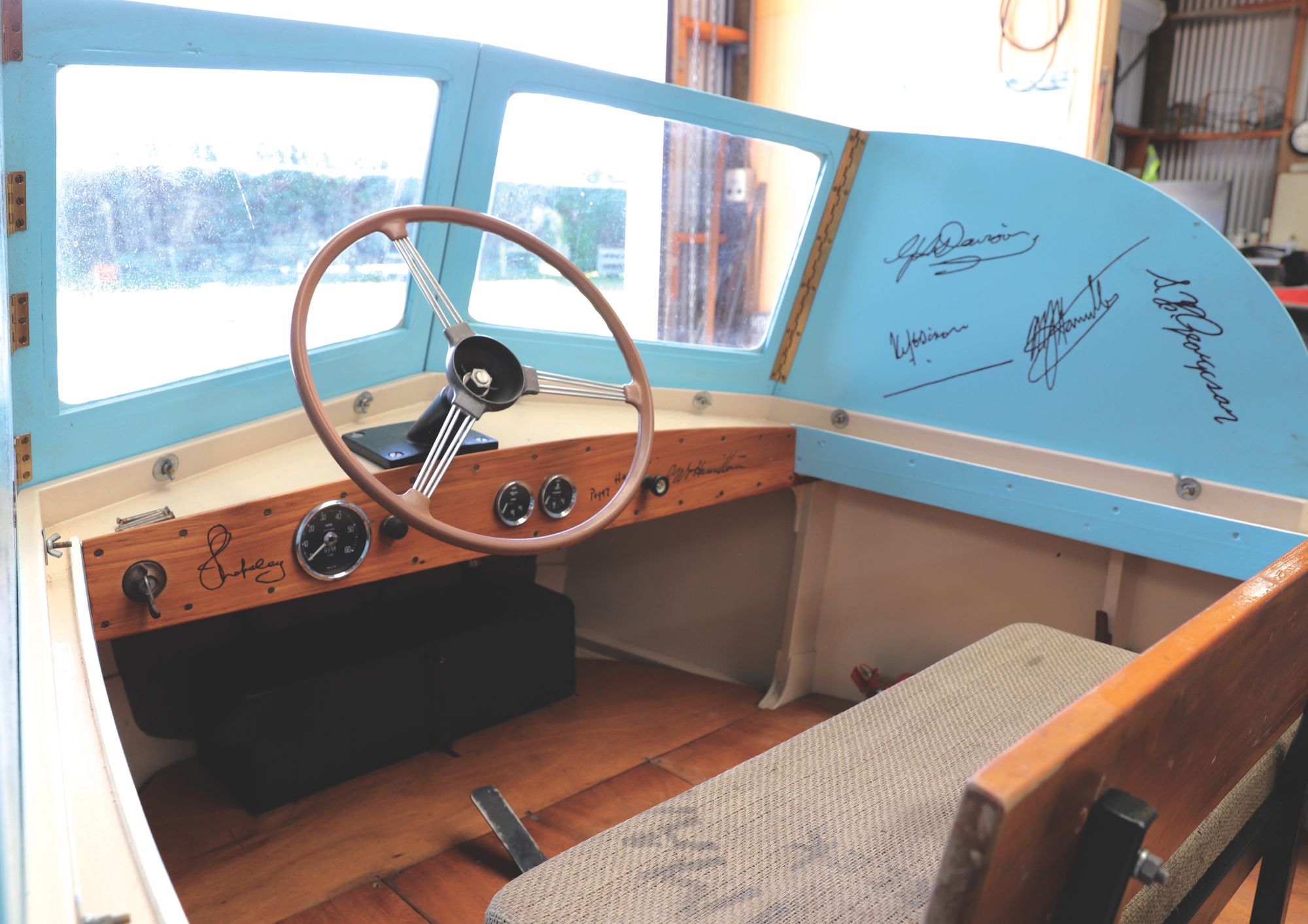 The craftsmanship and detail in the replica boat are stunning; Jim has left no stone unturned in his attempts to have it as authentic as possible. That includes a replica wool fadge seat cover emblazoned with Irishman Creek, the name of the sheep station near Tekapō where Hamilton undertook the work. Various branches of the Hamilton family, as well as other famous jetboating names, gave permission for their signatures to be etched onto the dash and side screen; the teal colour is as close as possible to the original, and even the fuel cap is located in the exact same spot.