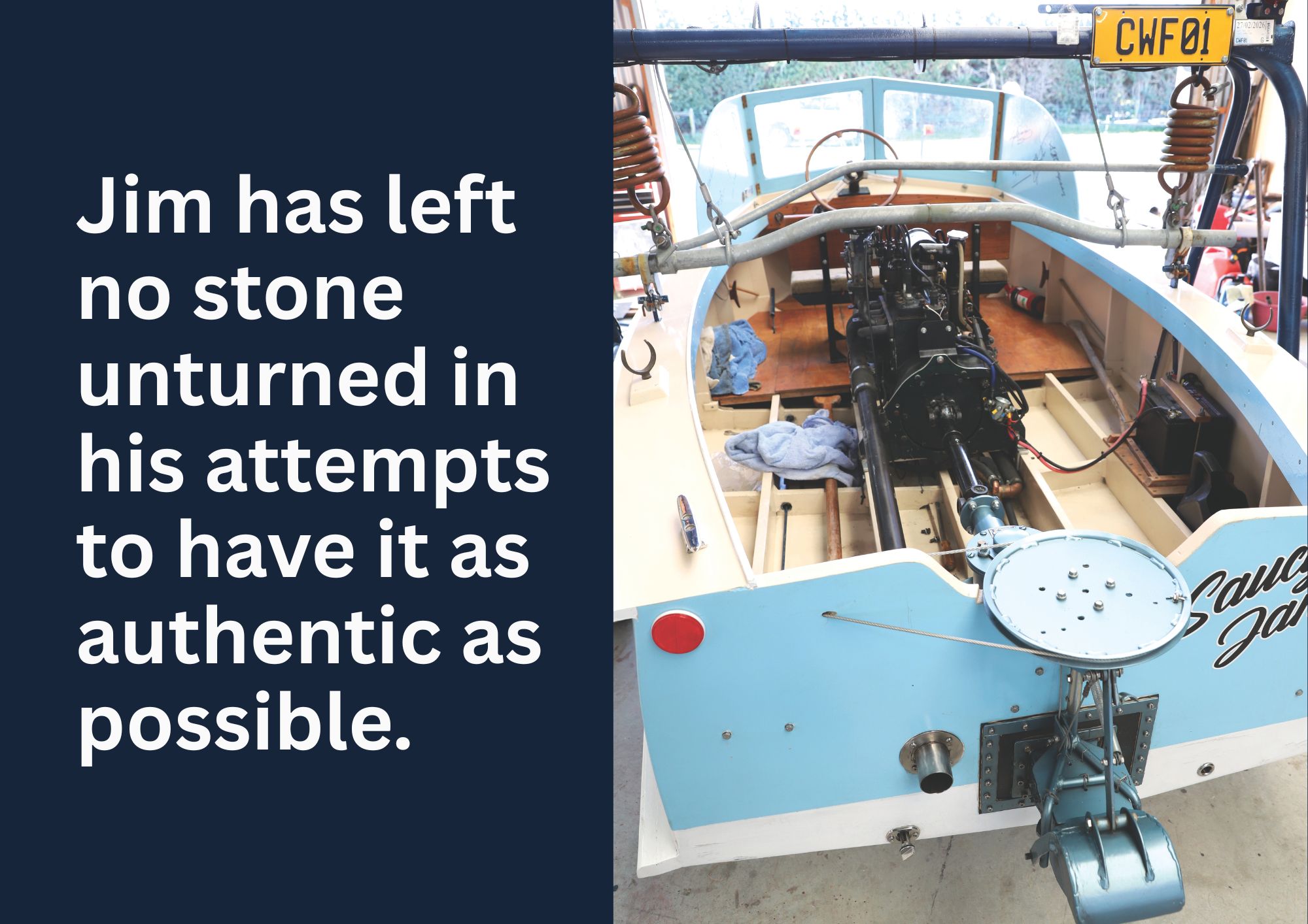And Jim is quick to acknowledge that undertaking the Saucy Jane project would not have been possible without the “110%” support of his wife, Noeleen. And, as for the name Saucy Jane? Well, no one’s exactly sure, but there is some suggestion that Bill’s wife, Lady Peggy, chose it, as she was an avid reader of Enid Blyton books, and one of those books is a story about a family and their boat, Saucy Jane.