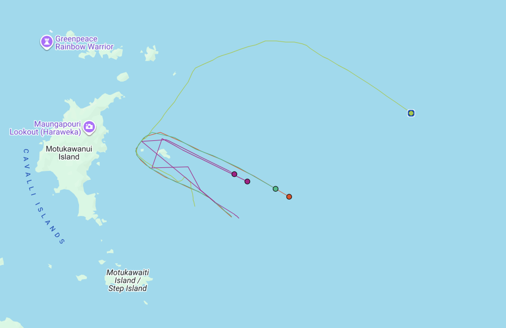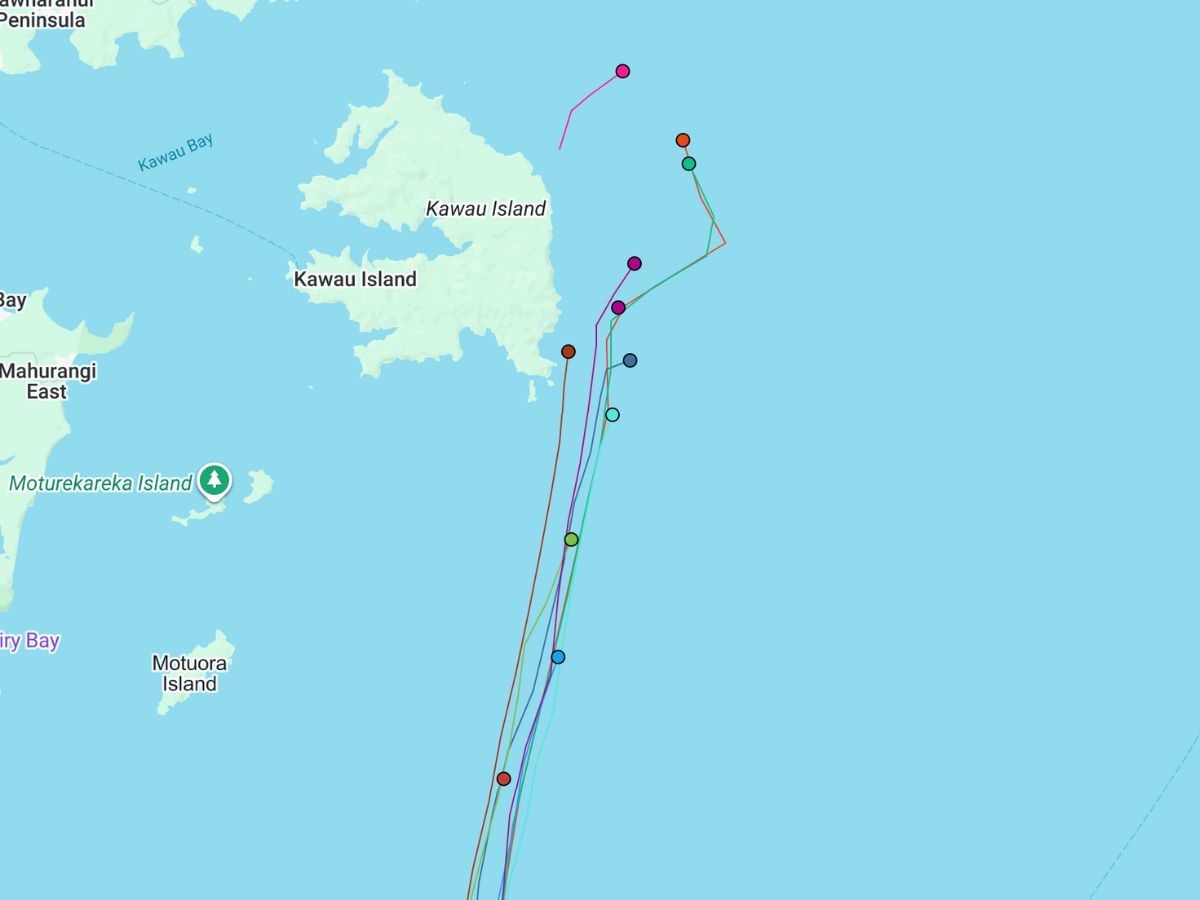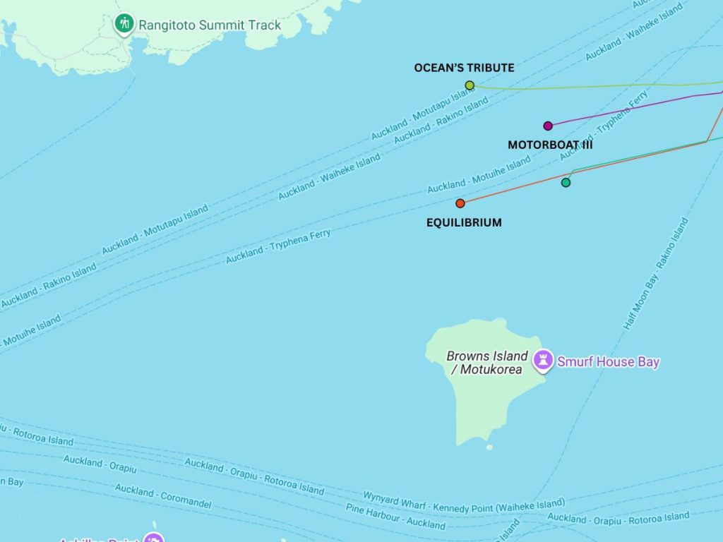 Higher Ground has crossed paths with Equilibrium in parallel with Purerua Peninsula, then a little while later Motorboat III. Ocean’s Tribute is further out to the east.