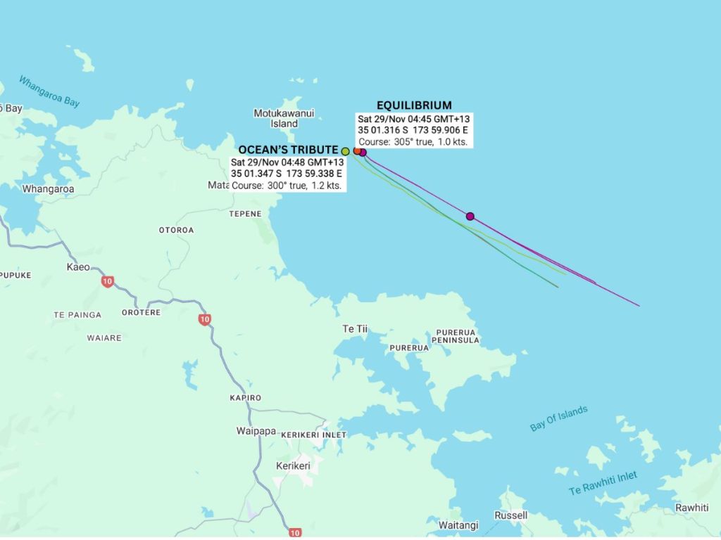 Sat 29 Nov 7:45pm update – Shortly, the three lead boats – Equilibrium, Ocean’s Tribute, and Motorboat III – will cross from the Northland region into Auckland waters. Equilibrium continues to set the pace, with Ocean’s Tribute holding a strong line off the height of Hen Island at about 6.6 knots.