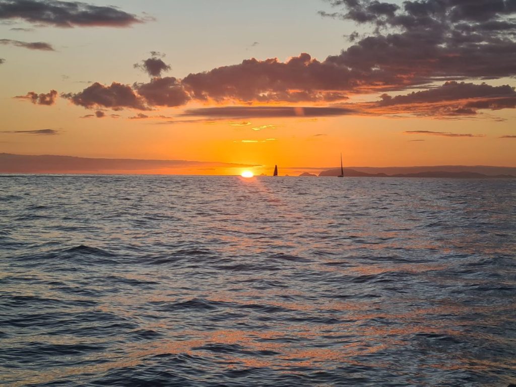 Kick is into happy hour mode on board, with another competitor lying off to starboard in the evening light. The fleet remains reasonably tight as the yachts push into their first night at sea.