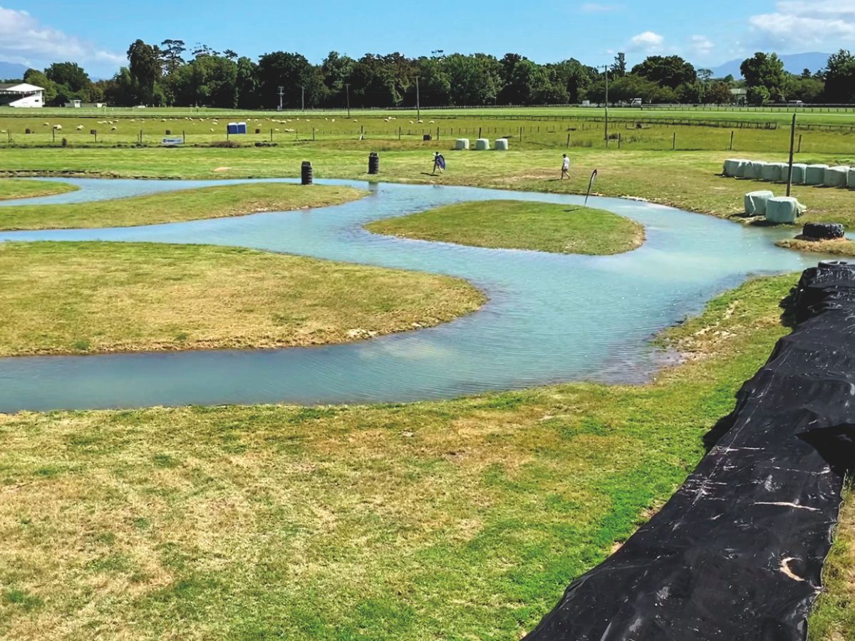 For most of the year, the Featherston jet sprint track looks like a few bumps and hollows in a grassy paddock. But in late spring, race organisers mow the grass, set up amenities for spectators and competitors, and pump in the water. The pumping system maintains a constant water level. Everyone is in the same boat. After the meeting is over, the water drains through the underlying gravel back into the river.
