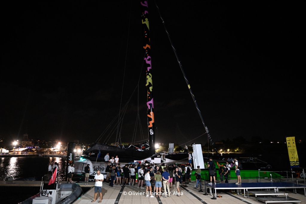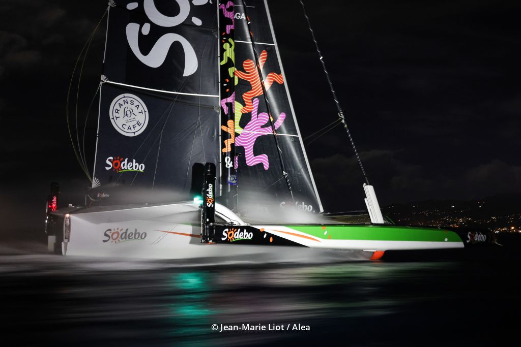 Covering the 5400-mile route between Le Havre and Fort-de-France at an average of 20.97 knots on the great-circle course, Coville and Schwartz actually sailed 6591 miles at 25.6 knots over the water—proof of how hard they pressed their 32-metre foiling trimaran.