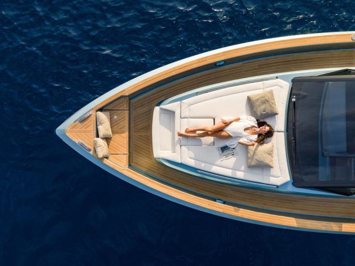 Forward, a redesigned bow lounge pairs a broad sunpad with a proper forward facing bench. The bulwarks are slimmer, yet still high enough to feel safe, and folding sidesteps set into the topsides let guests step from cockpit to water without clambering.