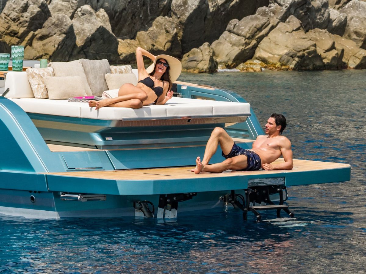 The walkaround layout suits family use, the enlarged T-Top and bimini bring shade into play, and the bigger galley and storage let you treat the boat as a floating batch rather than just a beach club tender. The hydraulic platform, proper tender garage and easier anchoring setup turn the stern into a water sports hub instead of a simple swim step.