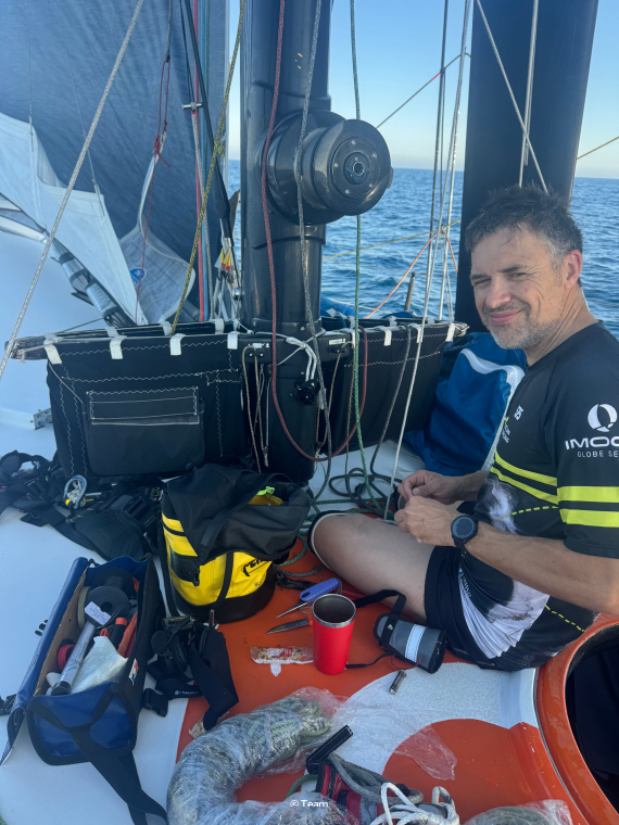 It takes very little to break a multihull pushed this hard. Edenred 5, the red rocket that had led much of the leg, suffered a major failure overnight when her carbon spinnaker pole tore free, damaging the rudder link bar. “We cut it away and sleeved a repair using the seaweed pole,” skipper Emmanuel Le Roch reported. “We’re back on the J0, but gutted — that’s racing.”