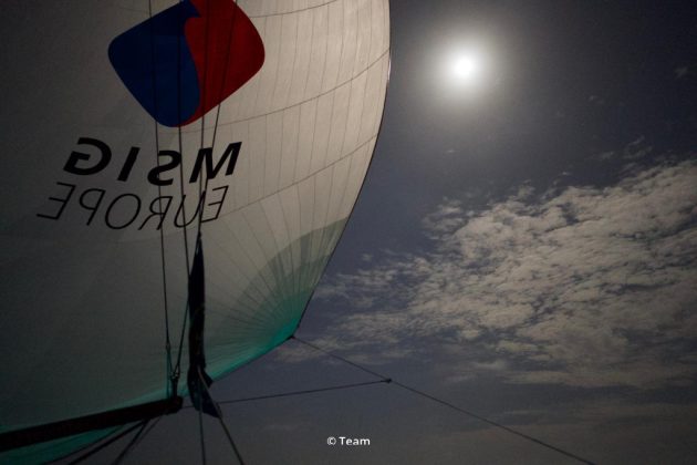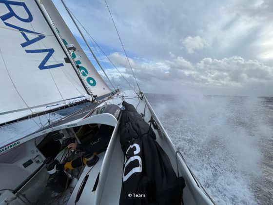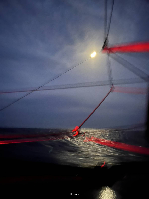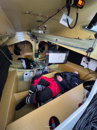 “It’s stressful but we’re going fast, so we just hang on,” Beyou told race control. With Morgan Lagravière, he’s alternating two-hour watches, fighting fatigue while refining every sail angle.