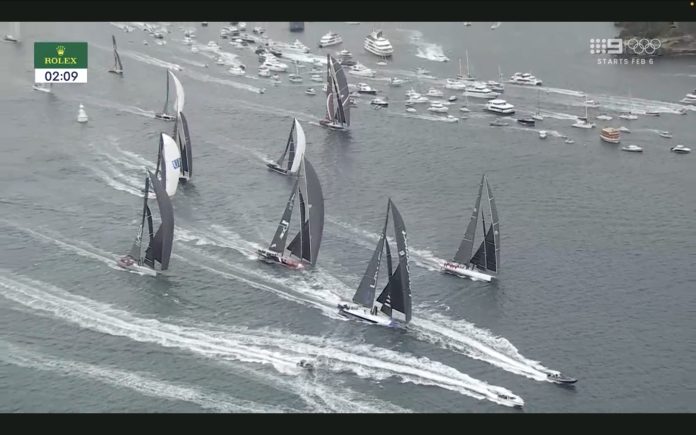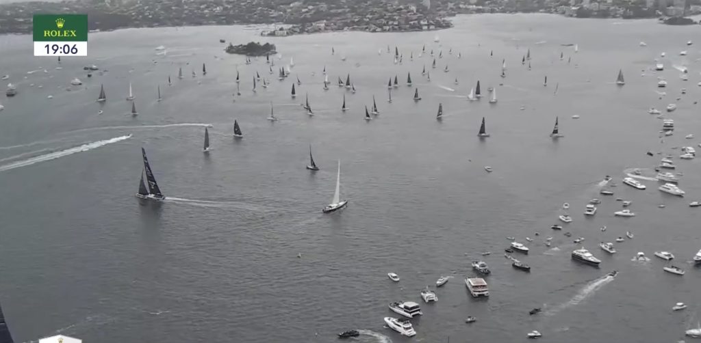 It will be spinnaker run-up the Harbour and then they’ll turn into the Tasman and will be bashed by the weather. Probably about five minutes until the first inner mark. The first night is expected to be tough.