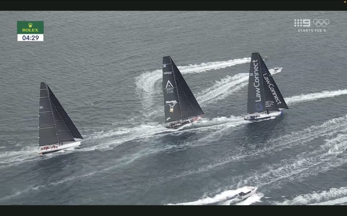 LawConnect deploys first for the third year running, gaining an early jump. She sits to leeward of Master Lock Comanche. Lucky also starts well, positioned further west, giving her a cleaner angle and potential early advantage.